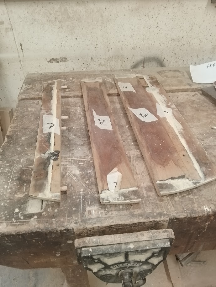 The boards for the top are disassembled, cleaned, squared and prepared for regluing with secret dowels for strength