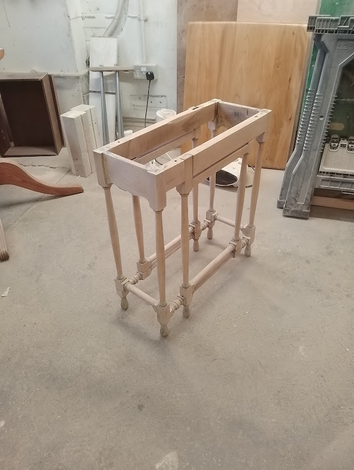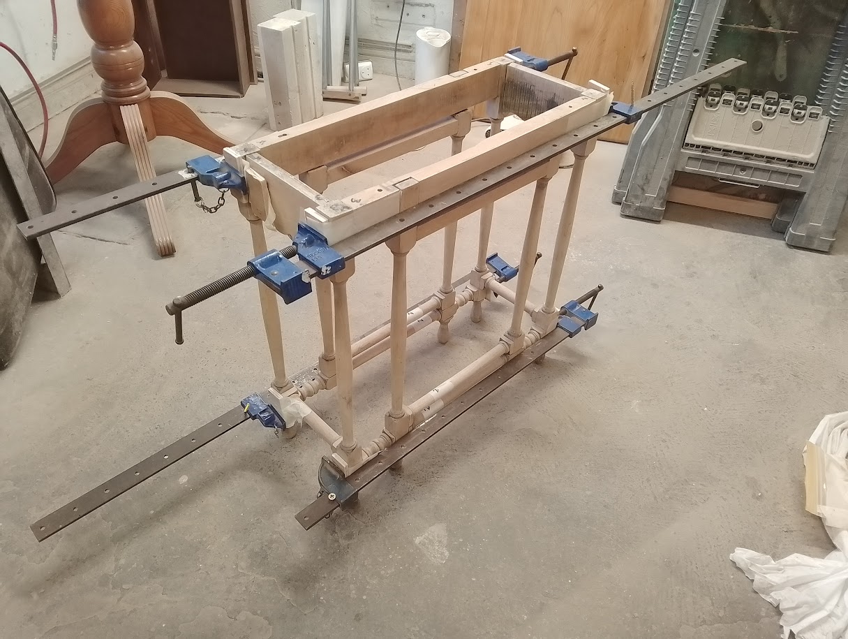 The frame work is dismantled, old adhesive is cleaned away before regluing and clamping