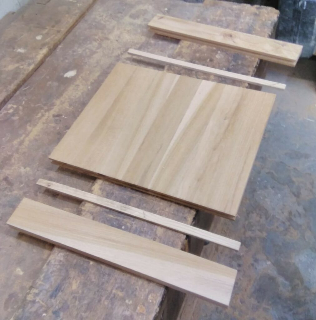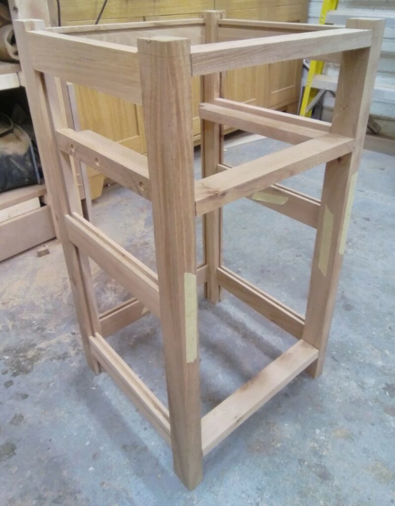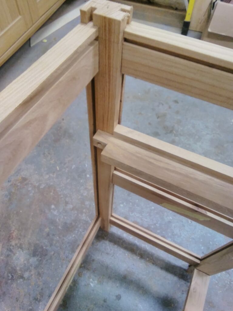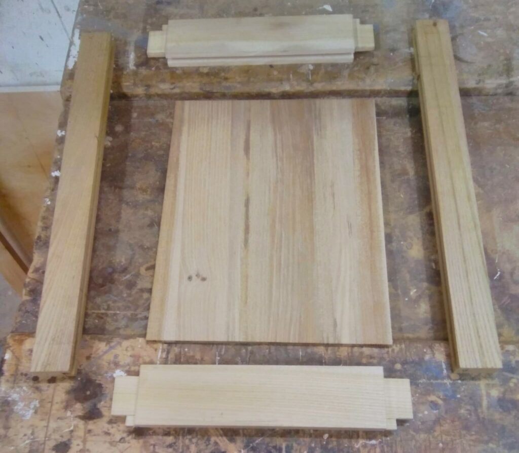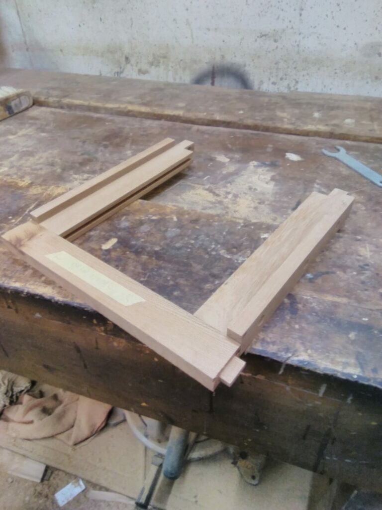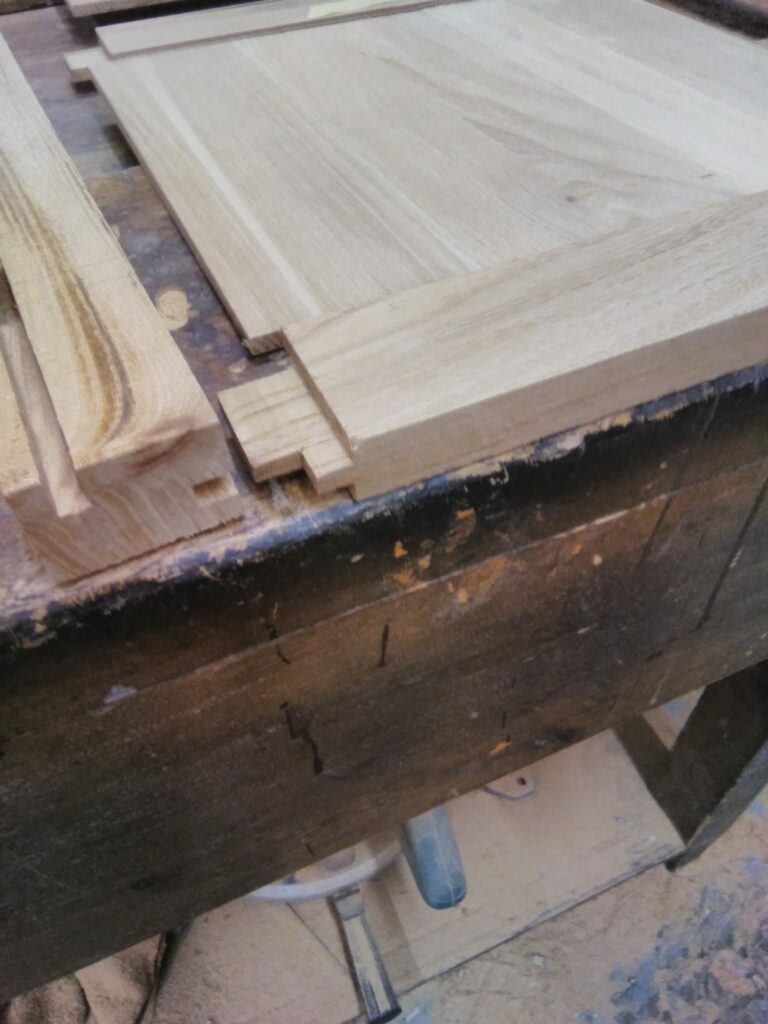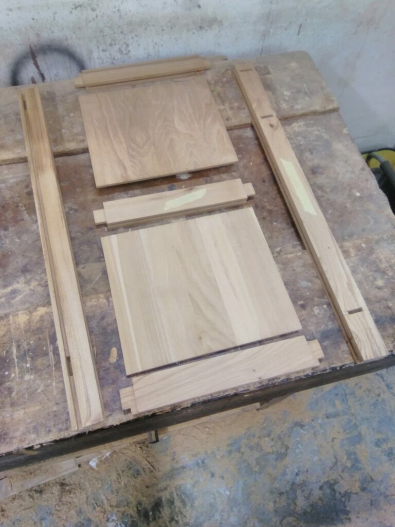 The first task was to set out the dimensions and proportions for a frame and panel construction. Then the mortice and tenons were set out to forn the side panels and rails for the front and back. Grooves are then set into the rails and stiles to receive floating panels