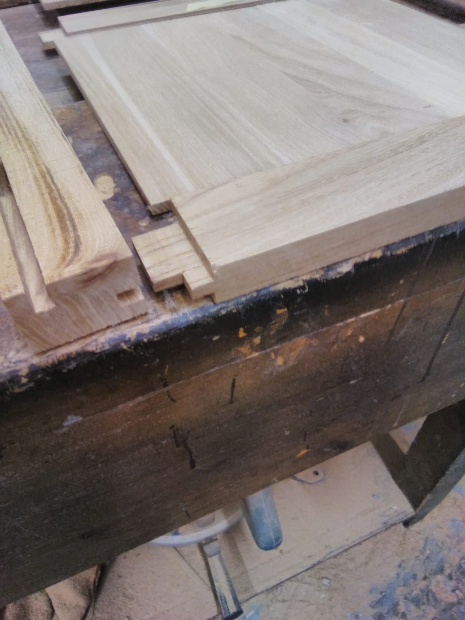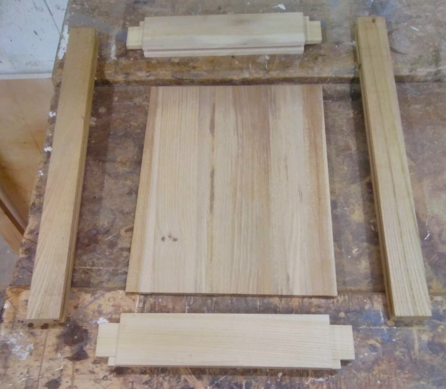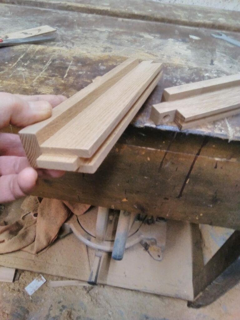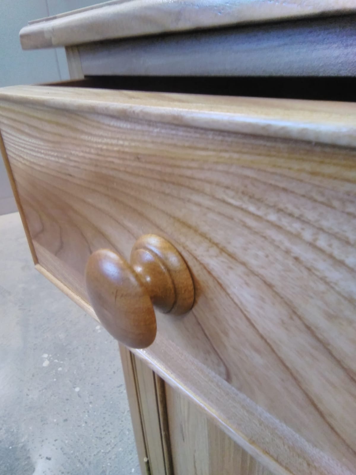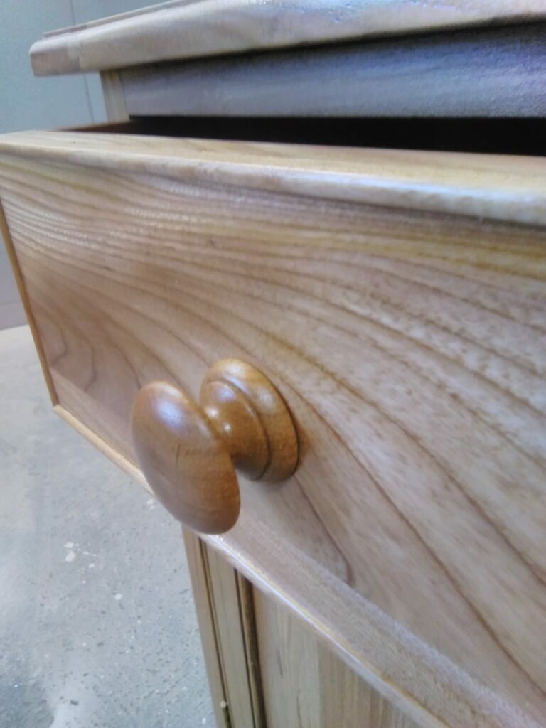Handles are turned from the elm for the door and draw