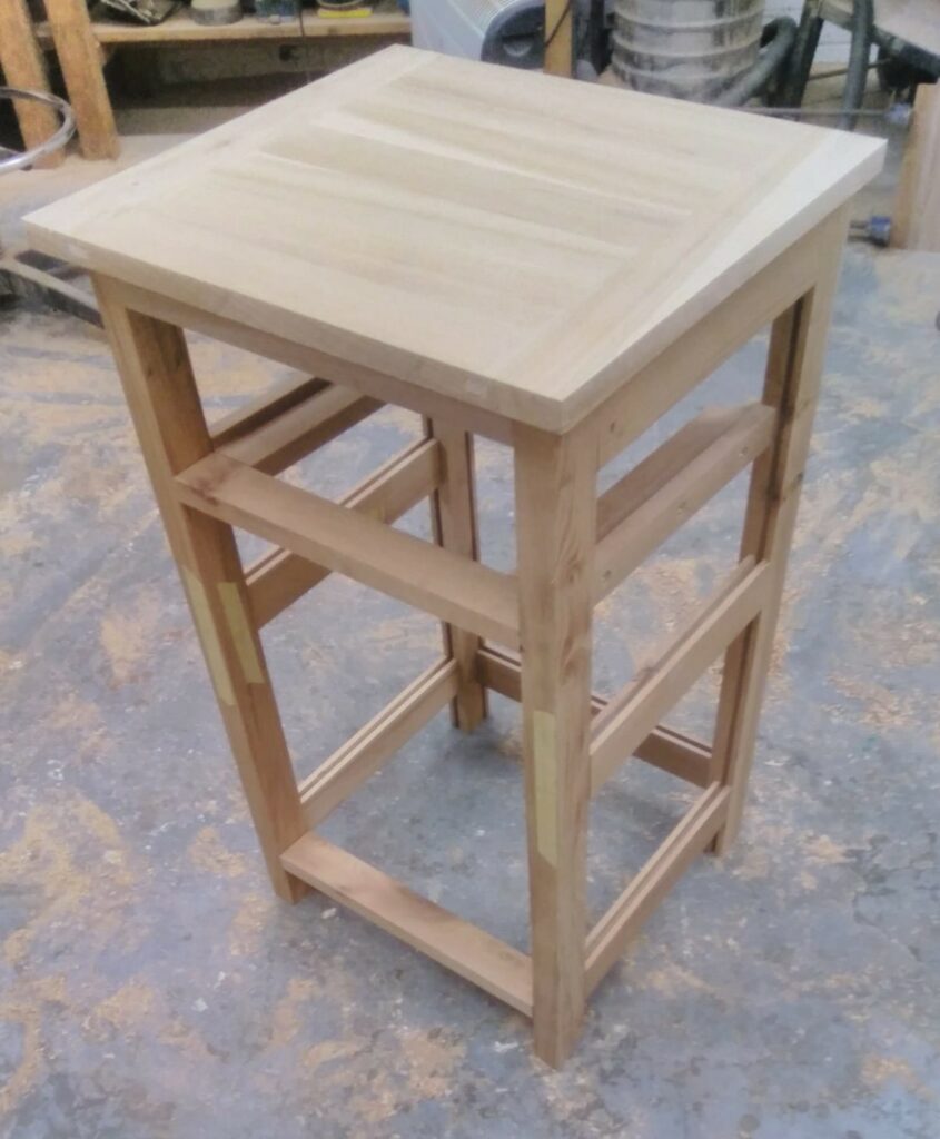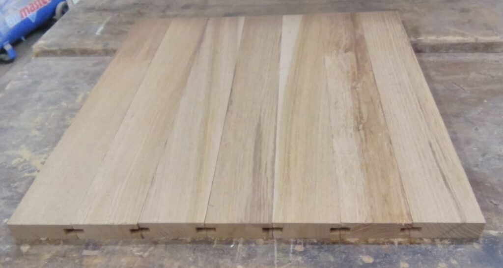 The top is made from tongued and grooved boards with strips to conceal the end grain