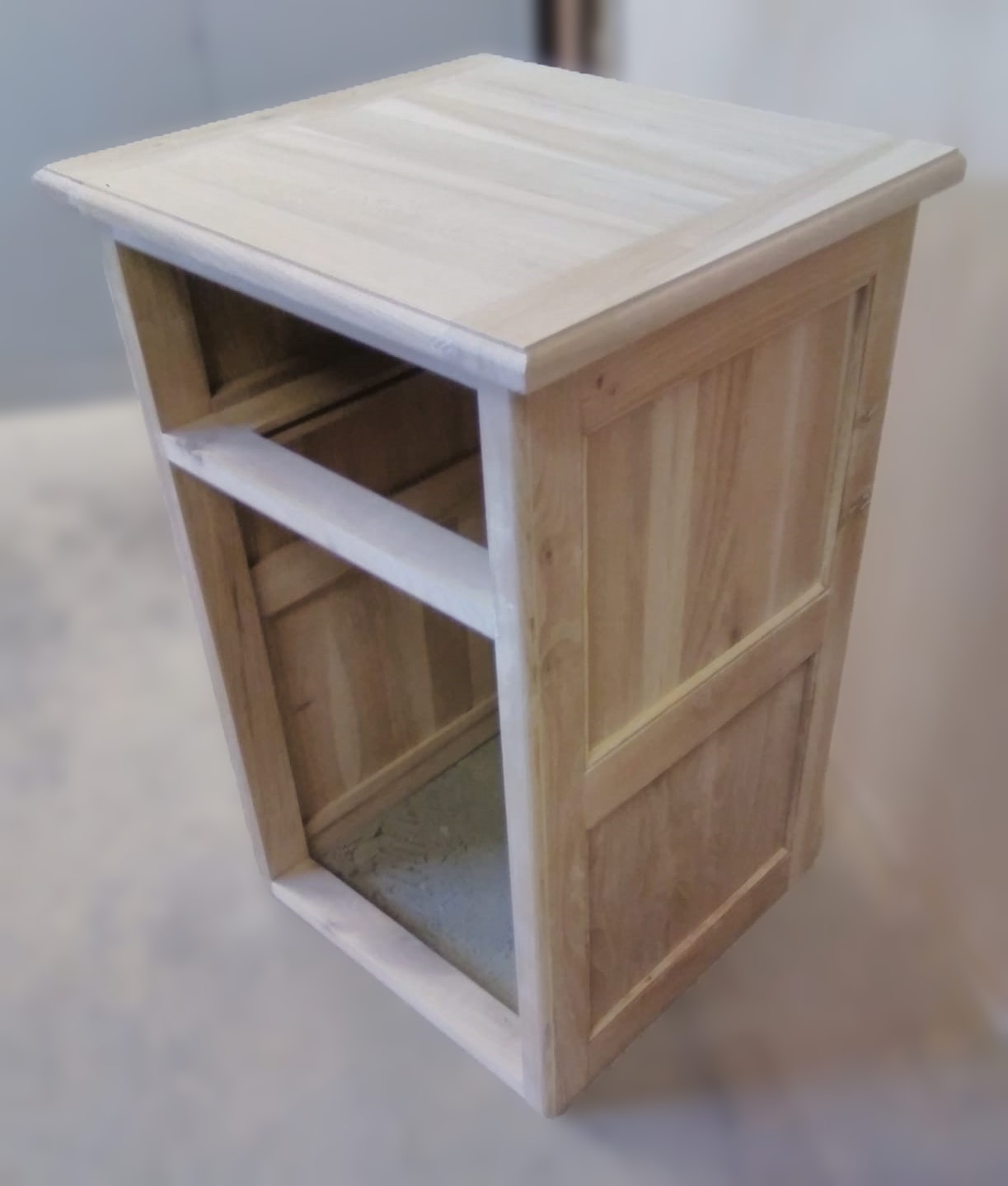 Each element was built with care — from shaping and moulding the edges to crafting the door and drawer using the same timeless joinery methods. The top, made from tongue-and-groove boards, was secured with timber buttons to allow flexibility in the wood, while a rebated inner edge gave the structure added refinement. Every curve and moulding was designed to balance practicality and visual appeal.