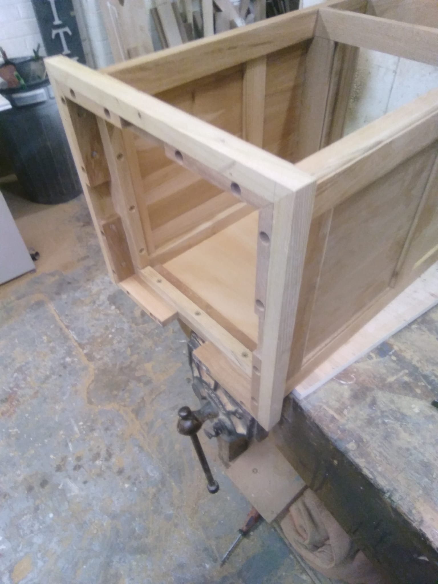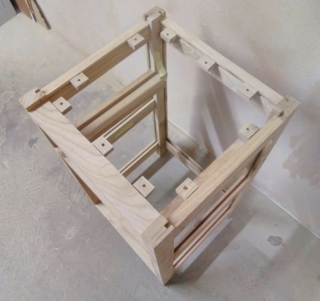 The carcass is glued up and a rebate cut all the way around the top inner edge to hold timber buttons to allow the top to be held down while allowing for shrinking and stretching