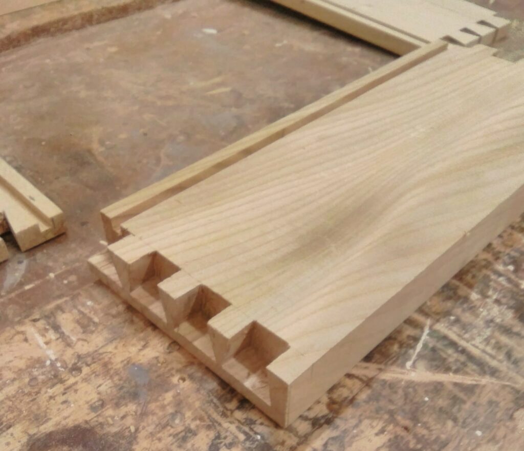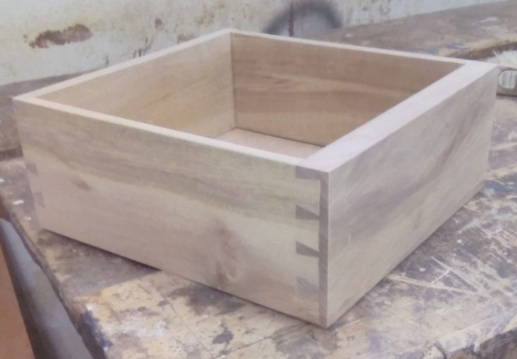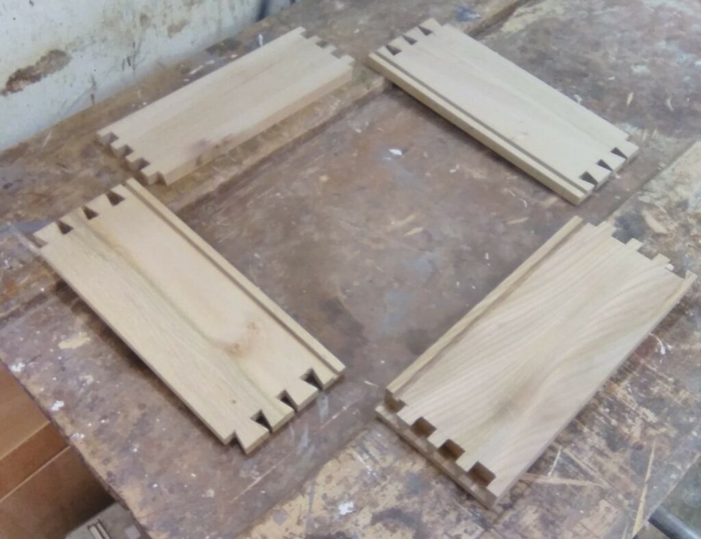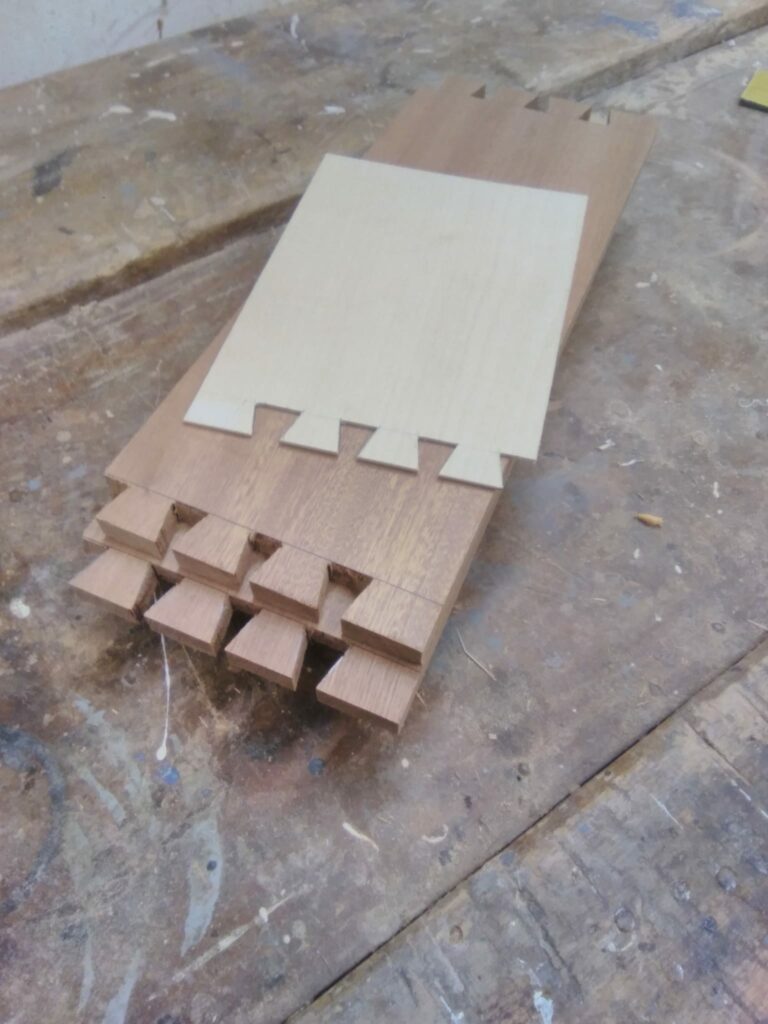 The draw components are set out, marked and cut with through and lapped dovetails. A groove is then set into the bottoms to receive a base
