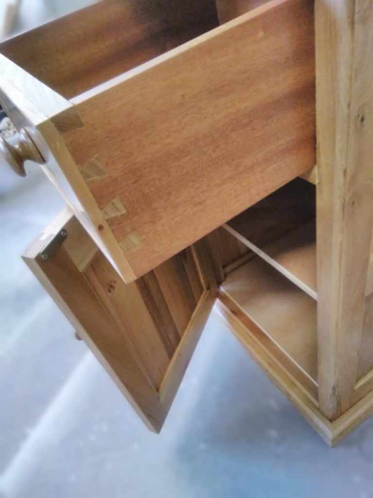 The back is fitted along with a shelf and dust board under the draw before the completed piece is sealed with three coats of lacquer.