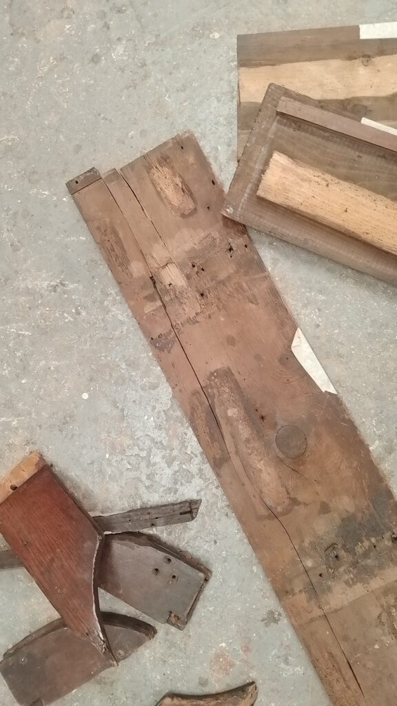 The interior had all but given way, with numerous pieces too damaged to save — fractured, weakened by woodworm, or simply missing. The original front apron looked charmingly naive but was poorly designed, with very little contact between its components, making it fragile and prone to collapse.