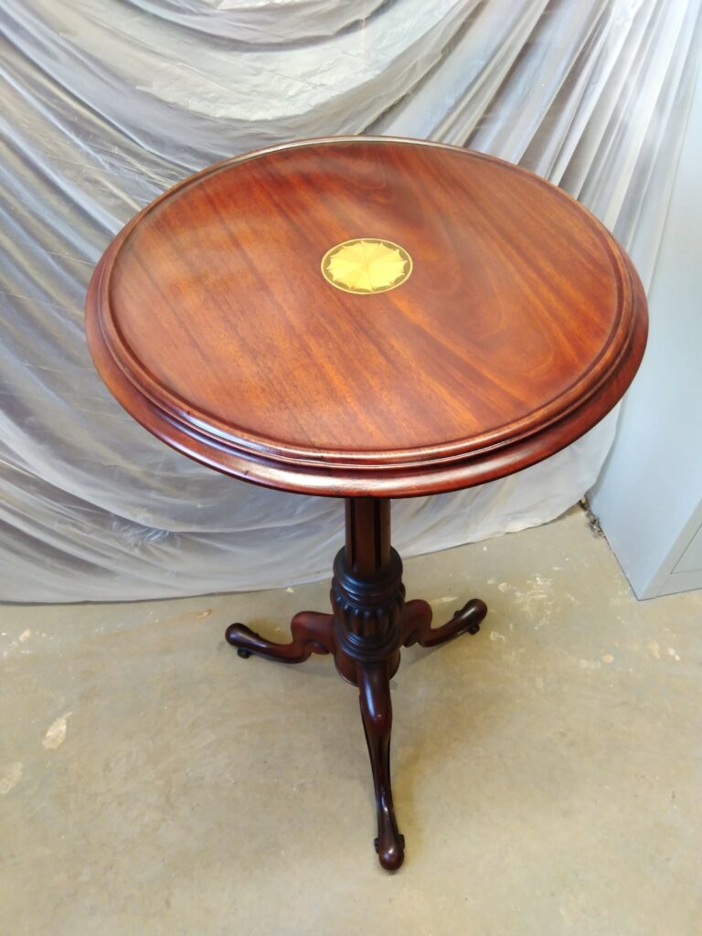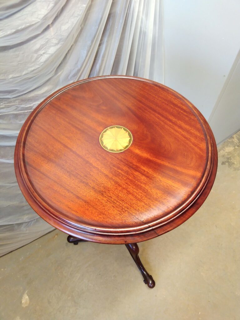 After further careful surface preparation, including fine sanding and final checks to ensure every repair blended seamlessly, the table was made fully ready for refinishing and polishing. These final stages will enhance the natural beauty of the timber while protecting the surface for everyday use. As a result of this detailed restoration process, the early nineteenth-century occasional table has now regained its character, functionality, and refined decorative presence, allowing it to be appreciated once more as both a practical and elegant piece.