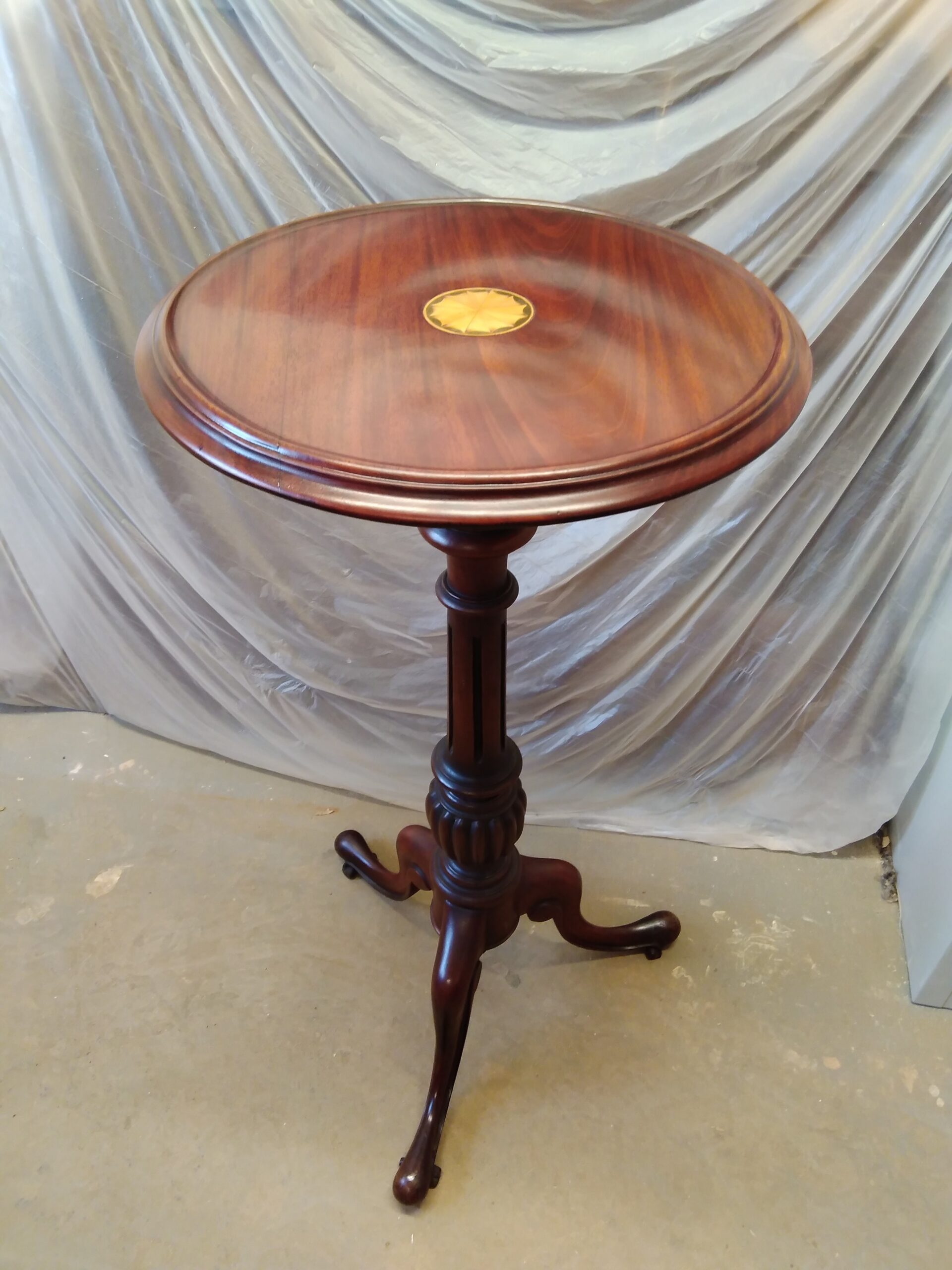 This beautiful early nineteenth-century occasional table arrived in very poor condition, with much of its original marquetry inlay missing and the top crudely nailed to the central column as part of an earlier, low-quality repair. As a result, the table had lost not only its refined elegance but also its original adjustable function, which would once have made it both decorative and practical. Originally, the table would have featured two or more graduated tiers fitted onto a threaded central spigot, allowing the height to be altered with ease to suit different uses within the home. Despite the damage, the quality of the mahogany and cherry structure and the surviving craftsmanship still clearly reflected its early nineteenth-century origins and potential for restoration.