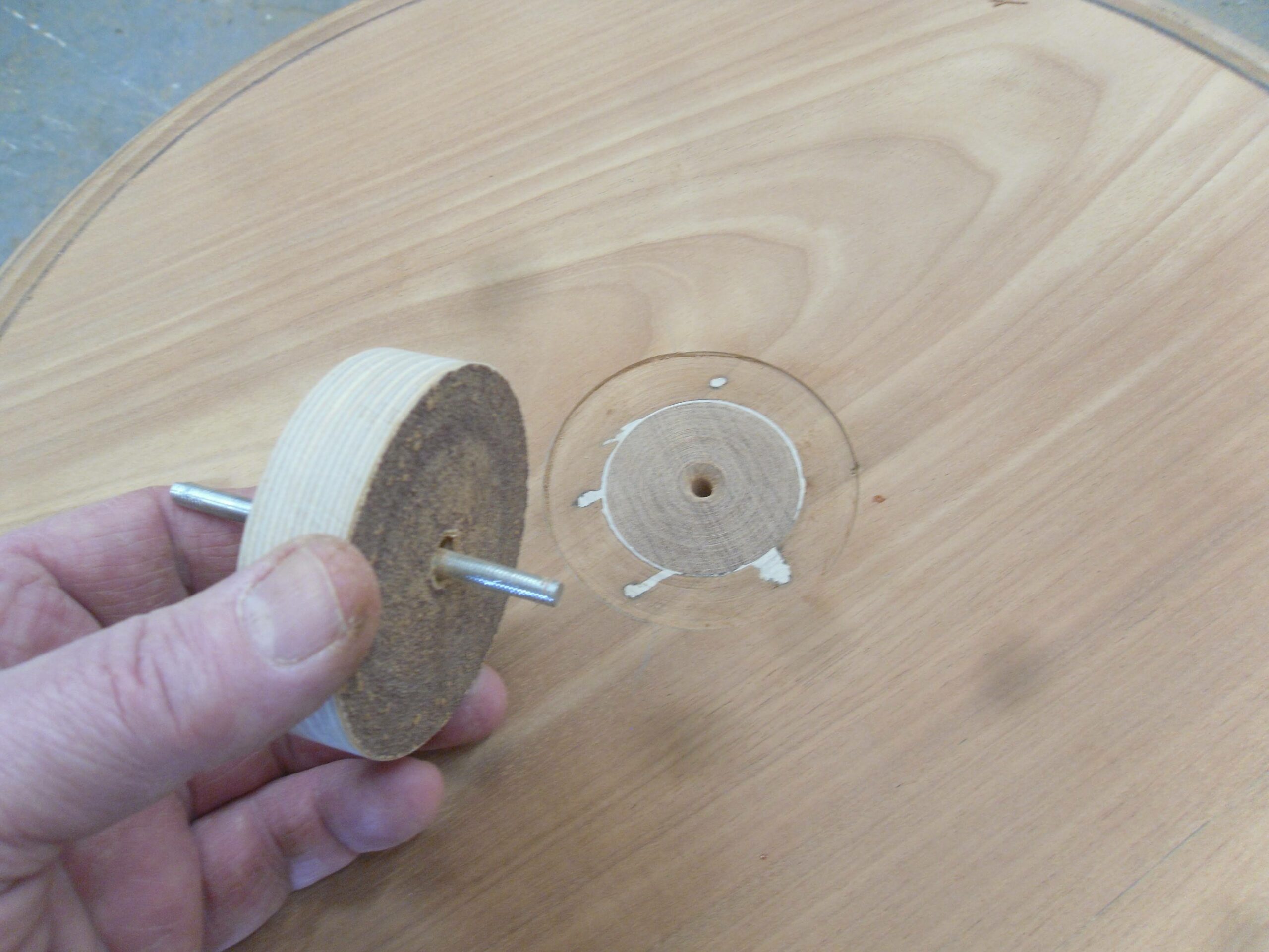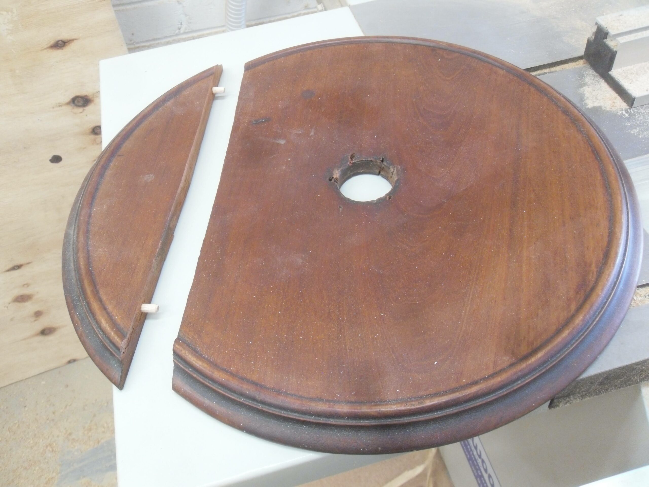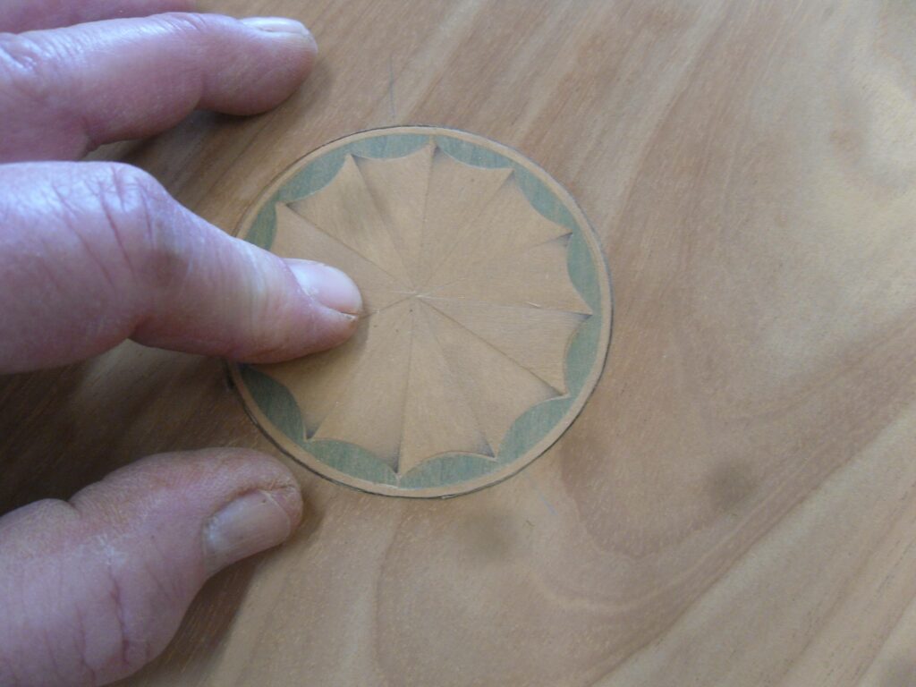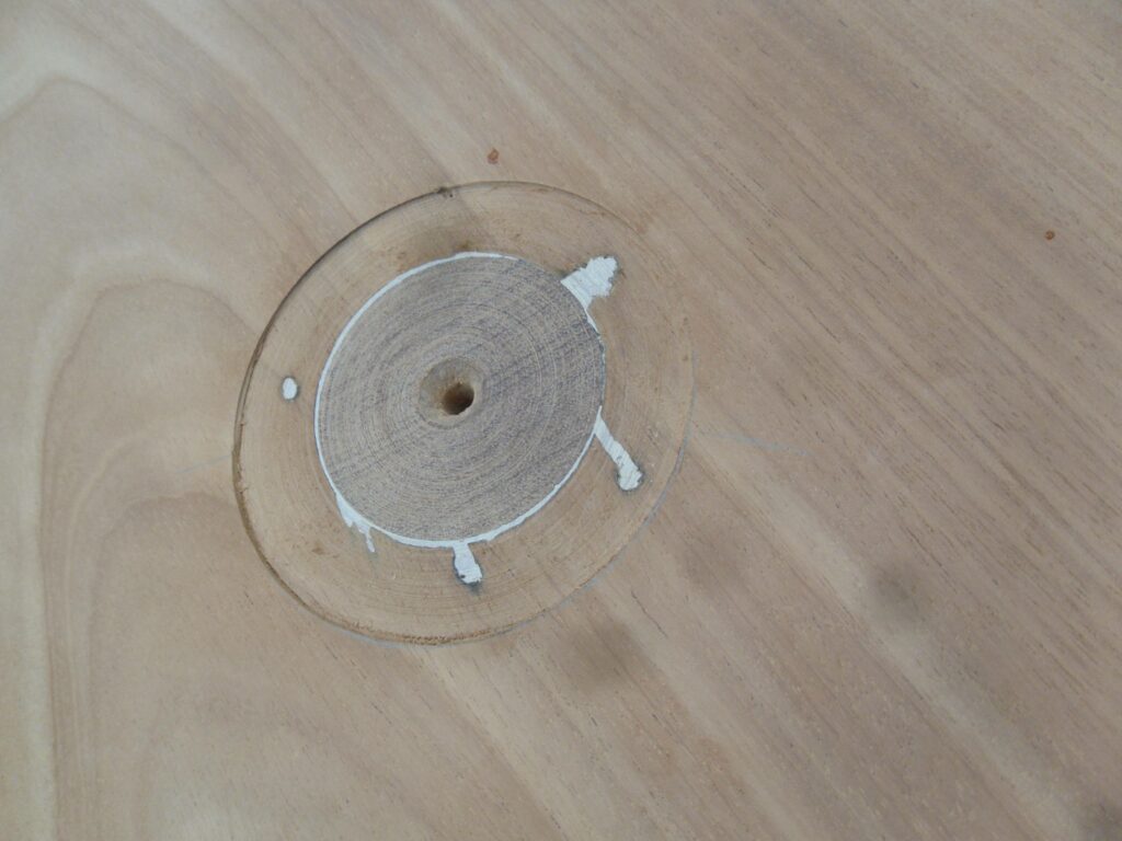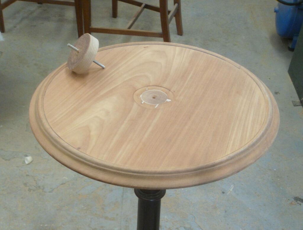 A shallow rebate was carefully cut into the centre of the tabletop to discreetly conceal the spigot repair while also creating a precise setting for a new marquetry decoration. To ensure a perfectly clean and even finish, a custom sanding tool was specially made to the exact diameter required, allowing the surface to be refined with accuracy and control. Once the preparation was complete, the new marquetry was meticulously glued into place, restoring the table’s decorative focal point and reintroducing the refined detail that would have originally defined its appearance.