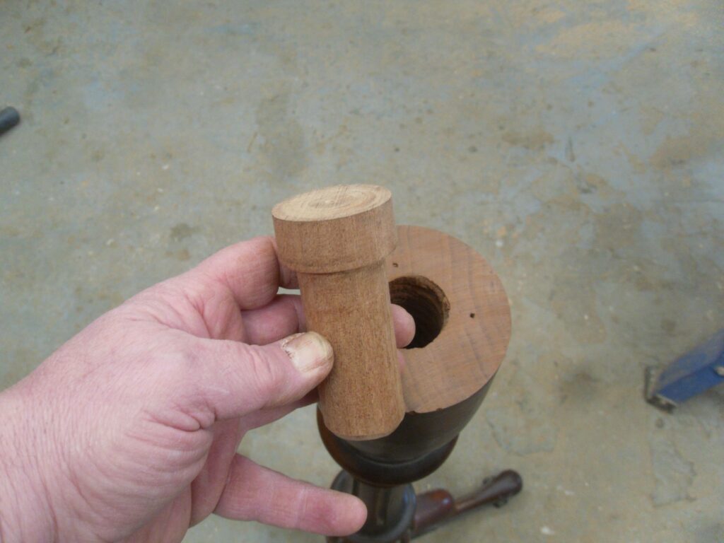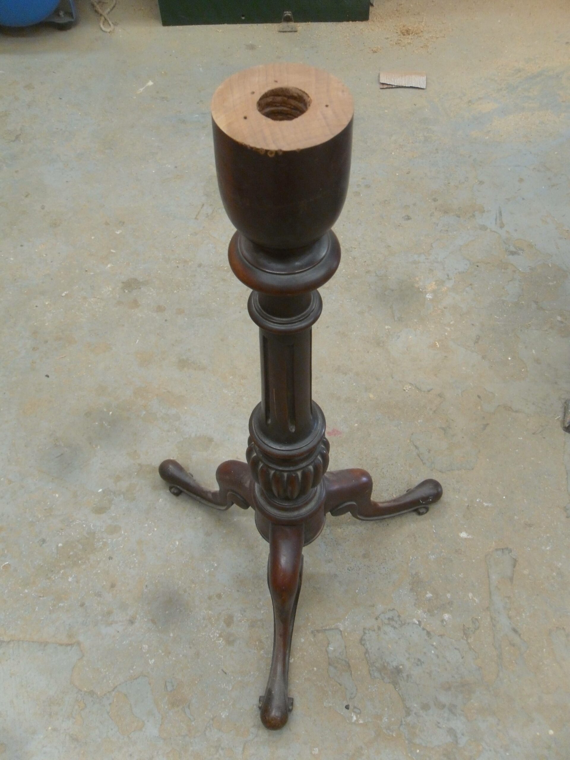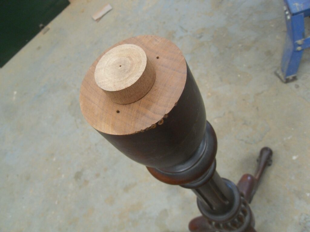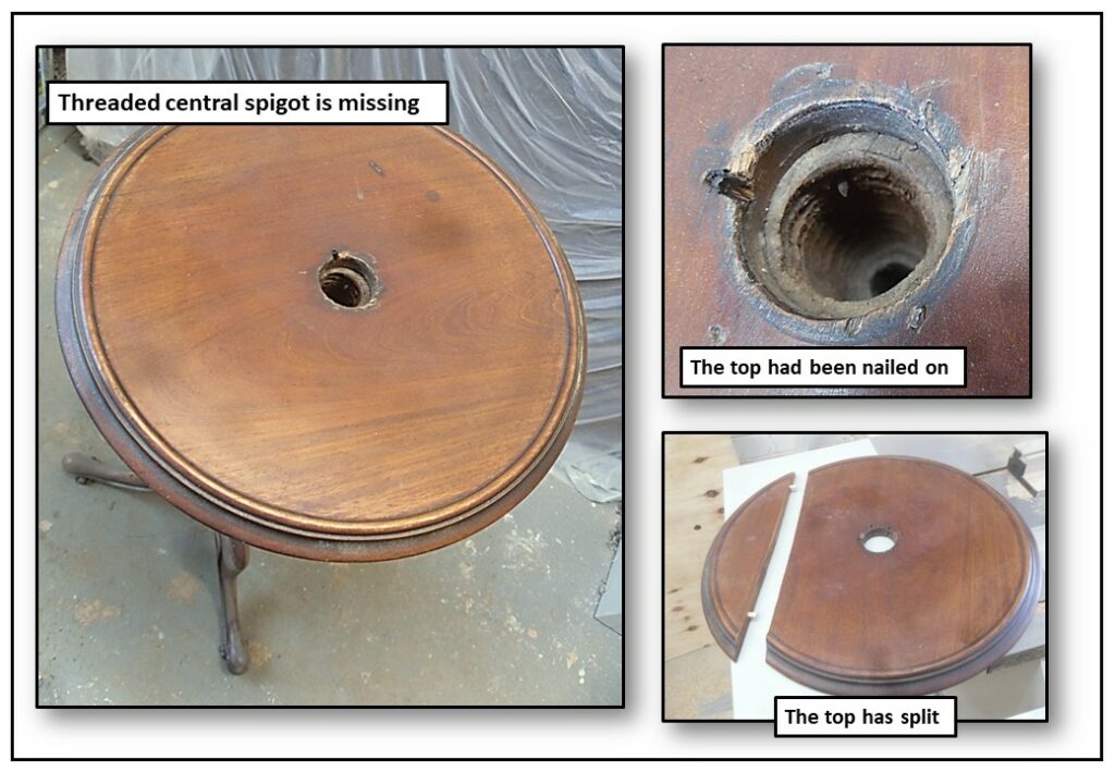 To restore the table’s original function, a brand new central spigot was carefully turned by hand and precisely fitted, allowing the top to be securely reconnected to the pedestal as it would have been originally. This critical structural repair returned the table’s adjustable mechanism and ensured the correct alignment of all components. The cracked tabletop was then reglued with great care and further strengthened with discreet dowel reinforcements, providing the necessary long-term stability while preserving the integrity of the original timber.