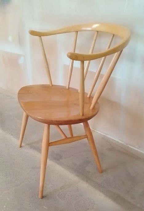 The arms and back are made from a single piece of steam-bent beech. This technique gives the chairs their flowing, organic curve. Moreover, it shows the craftsmanship that made Ercol famous.