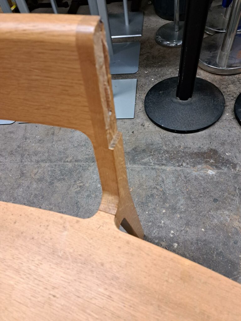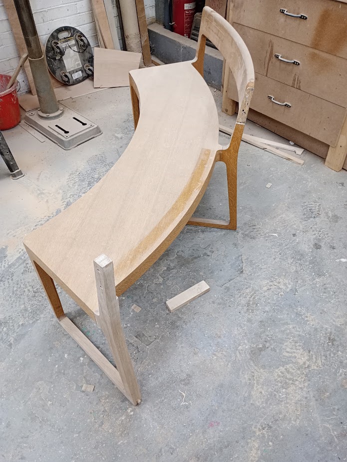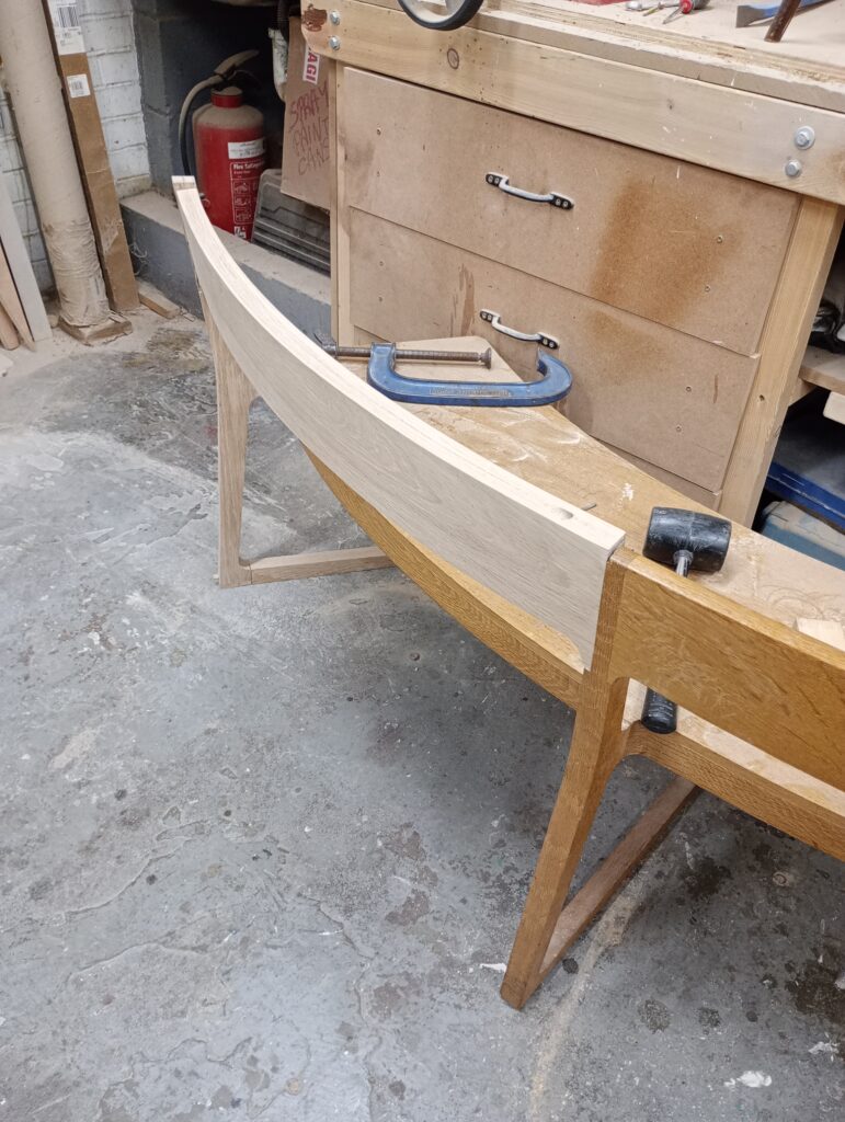 Once the new end frame was fitted and secured, we turned our attention to the curved backrest. The back was originally made of two steam-bent sections, each requiring very careful shaping and alignment. Reproducing this curve was a demanding process. It not only needed to follow the original sweep but also to meet the uprights at a compound angle.