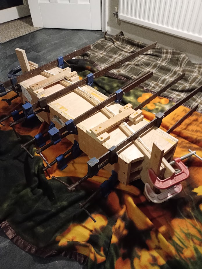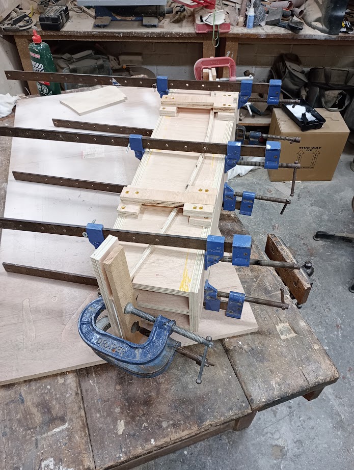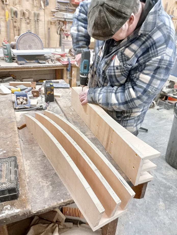 Creating the new backrest began with making a precise template. After a couple of unsuccessful attempts, we achieved the perfect curve. A laminating mould was then built to glue together thin strips of oak into the correct shape and thickness. Because the workshop was near freezing temperatures that winter, we had to bring the gluing process indoors to prevent the adhesive from failing — any cold could cause delamination later.