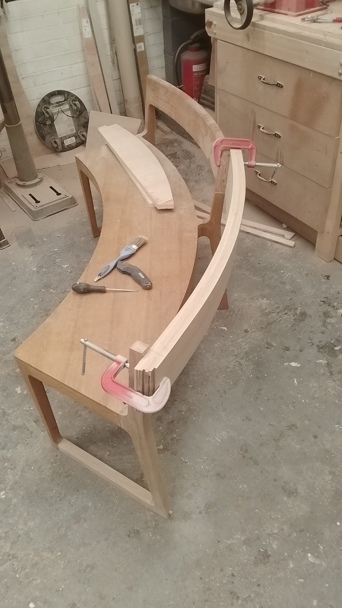 Once the new end frame was fitted and secured, we turned our attention to the curved backrest. The back was originally made of two steam-bent sections, each requiring very careful shaping and alignment. Reproducing this curve was a demanding process. It not only needed to follow the original sweep but also to meet the uprights at a compound angle.